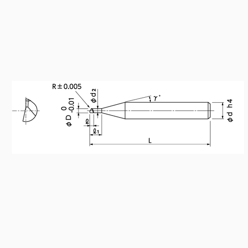 | Code No. | (D)Dia. | (R)Corner Radius | (l)Length of Cut | (l1)Under Neck Length | (d2)Neck Dia. | (γ)Neck Taper Angle | (d)Shank Dia. | (L)Overall Length |