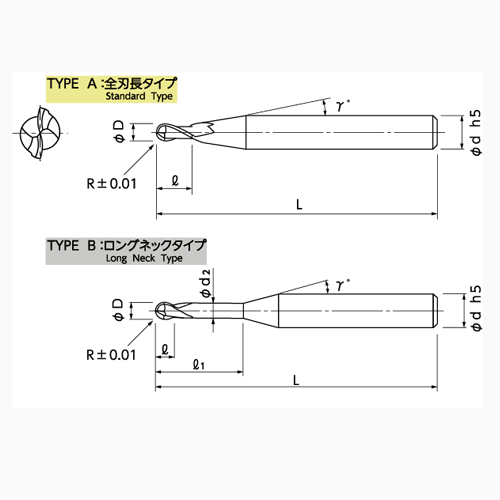 | Code No. | (R)Radius | (l)Length of Cut | (l1)Under neck Length | Type | (D)Dia. | (d2)Neck Dia. | (γ)Neck Taper Angle | (d)Shank Dia. | (L)Overall Length |